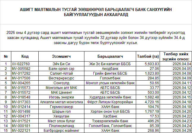 Тусгай зөвшөөрлийн төлбөрөө төлж бүртгүүлэхийг мэдэгдье