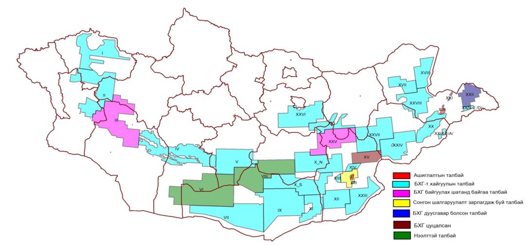 Монгол Улсын хэмжээнд газрын тосны хэтийн төлөв бүхий 34 талбай ялгаснаас 2025 оны байдлаар Засгийн газрын баталсан Бүтээгдэхүүн хуваах гэрээний дагуу 4 талбайд газрын тосны ашиглалтын үйл ажиллагаа явагдаж байна. Үүнд Тосон-Уул XIX, Тамсаг XXI талбайд Петрочайна Дачин Тамсаг ХХК, 1997 оны БХГ-т талбайд Доншен Газрын тос (Монгол) ХХК, Матад XX талбайд Петроматад ХХК нь тус тус газрын тосны олборлолт, ашиглалтын үйл ажиллагааг явуулж байна. /Зураг-1/
