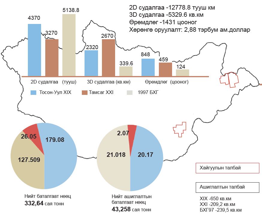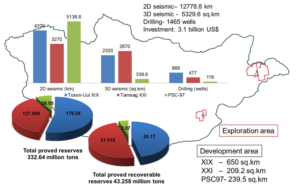 Өнгөрсөн хугацаанд 1993-2024 онд хайгуул, үнэлгээ, туршилтын олборлолт, ашиглалтын нийт 1,746 цооног өрөмдөж, 13.6 мянган тууш км хоёр хэмжээст, 5.4 мянган км2 гурван хэмжээст чичирхийллийн судалгаа хийсэн. 1993-2024 онд Тосон-Уул XIX, Тамсаг XXI, БХГ-97, Матад XX талбайд нийт 4.28 тэрбум ам.доллар (2019-2024 оны тоон мэдээ санхүүгийн шалгалтаар баталгаажаагүй дүн болно)-ын хөрөнгө оруулсан.