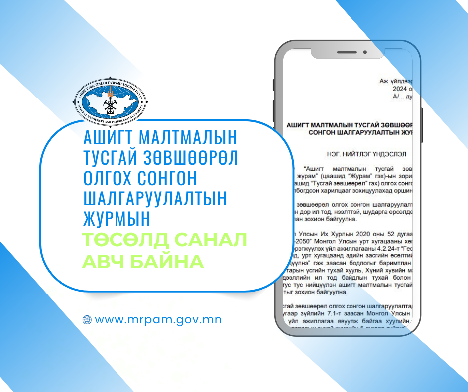“Ашигт малтмалын тусгай зөвшөөрөл олгох сонгон шалгаруулалтын журам”-д нэмэлт өөрчлөлт оруулах ажлын хүрээнд журмын төсөлд санал авч байгаа тул Аж үйлдвэр, эрдэс баялгийн яамны цахим хуудсанд хандаж саналаа өгнө үү.