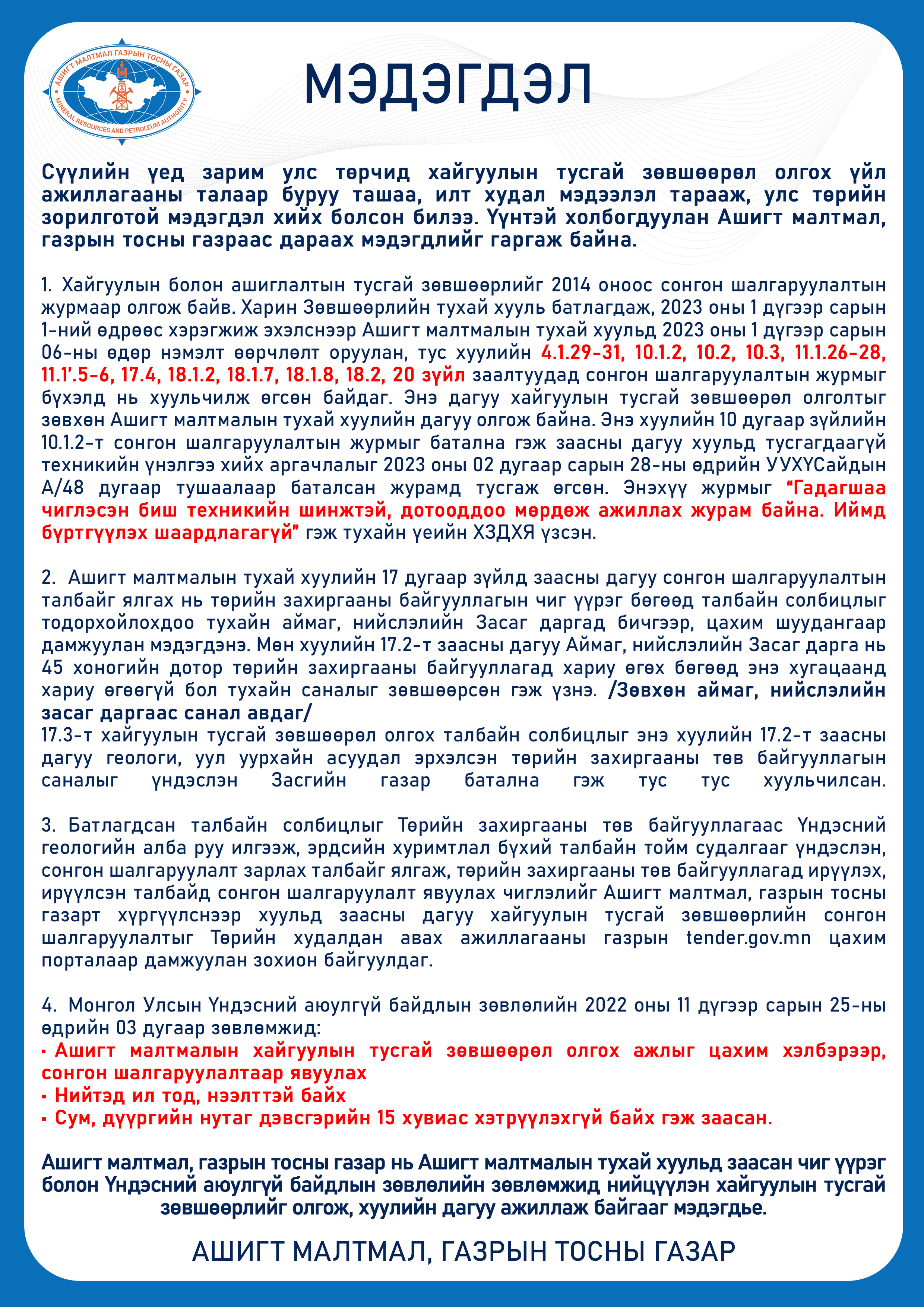 Нэг. Хайгуулын болон ашиглалтын тусгай зөвшөөрлийг 2014 оноос сонгон шалгаруулалтын журмаар олгож байв. Харин Зөвшөөрлийн тухай хууль батлагдаж, 2023 оны 1 дүгээр сарын 1-ний өдрөөс хэрэгжиж эхэлснээр Ашигт малтмалын тухай хуульд 2023 оны 1 дүгээр сарын 06-ны өдөр нэмэлт өөрчлөлт оруулан, тус хуулийн 4.1.29-31, 10.1.2, 10.2, 10.3, 11.1.26-28, 11.1’.5-6, 17.4, 18.1.2, 18.1.7, 18.1.8, 18.2, 20 зүйл заалтуудад сонгон шалгаруулалтын журмыг бүхэлд нь хуульчилж өгсөн байдаг. Энэ дагуу хайгуулын тусгай зөвшөөрөл олголтыг зөвхөн Ашигт малтмалын тухай хуулийн дагуу олгож байна.