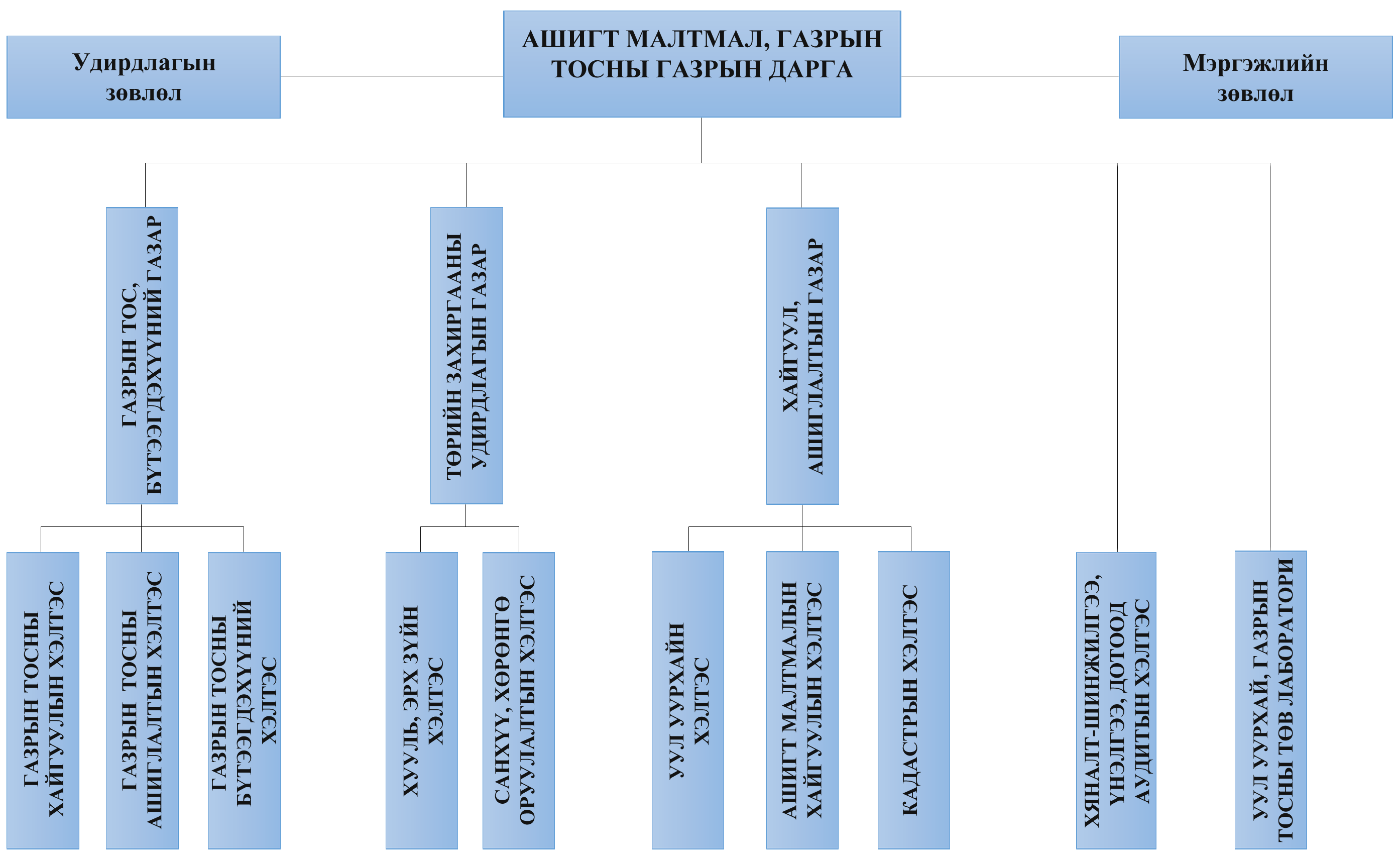 Төрийн захиргааны удирдлагын манлайлал, хүний нөөцийн удирдлагаар хангах, байгууллагын хөрөнгө санхүүгийн эх үүсвэрийг оновчтой удирдах, тайлагнах, газрын тостой холбоотой үйл ажиллагааны орлогыг тооцох, төсөвт төвлөрүүлэх, гэрээлэгчдийн төлөвлөгөө төсөв, өртөг нөхөгдөх зардлыг хянах, ашигт малтмалын хайгуулын ажлын зардлын доод хэмжээг баталгаажуулах;