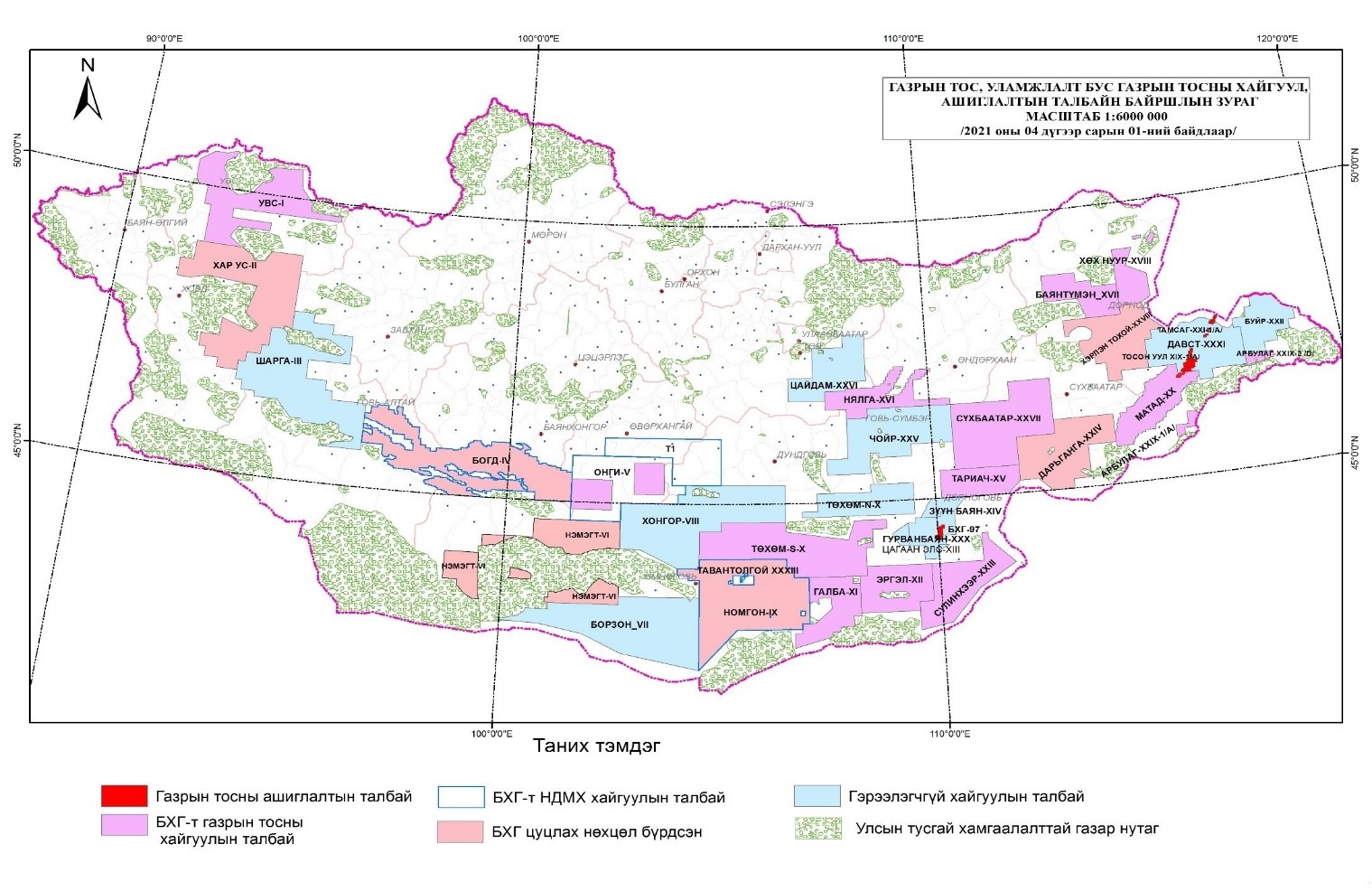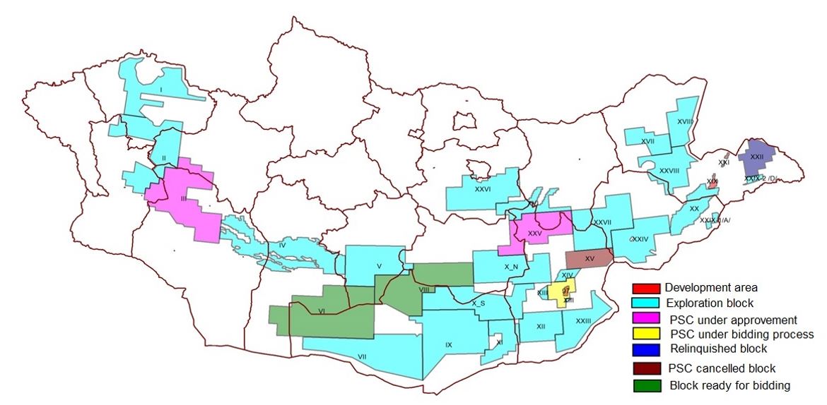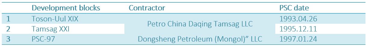 Монгол Улсын хэмжээнд газрын тосны хэтийн төлөв бүхий 34 талбай ялгаснаас 2025 оны байдлаар Засгийн газрын баталсан Бүтээгдэхүүн хуваах гэрээний дагуу 4 талбайд газрын тосны ашиглалтын үйл ажиллагаа явагдаж байна. Үүнд Тосон-Уул XIX, Тамсаг XXI талбайд Петрочайна Дачин Тамсаг ХХК, 1997 оны БХГ-т талбайд Доншен Газрын тос (Монгол) ХХК, Матад XX талбайд Петроматад ХХК нь тус тус газрын тосны олборлолт, ашиглалтын үйл ажиллагааг явуулж байна. /Зураг-1/