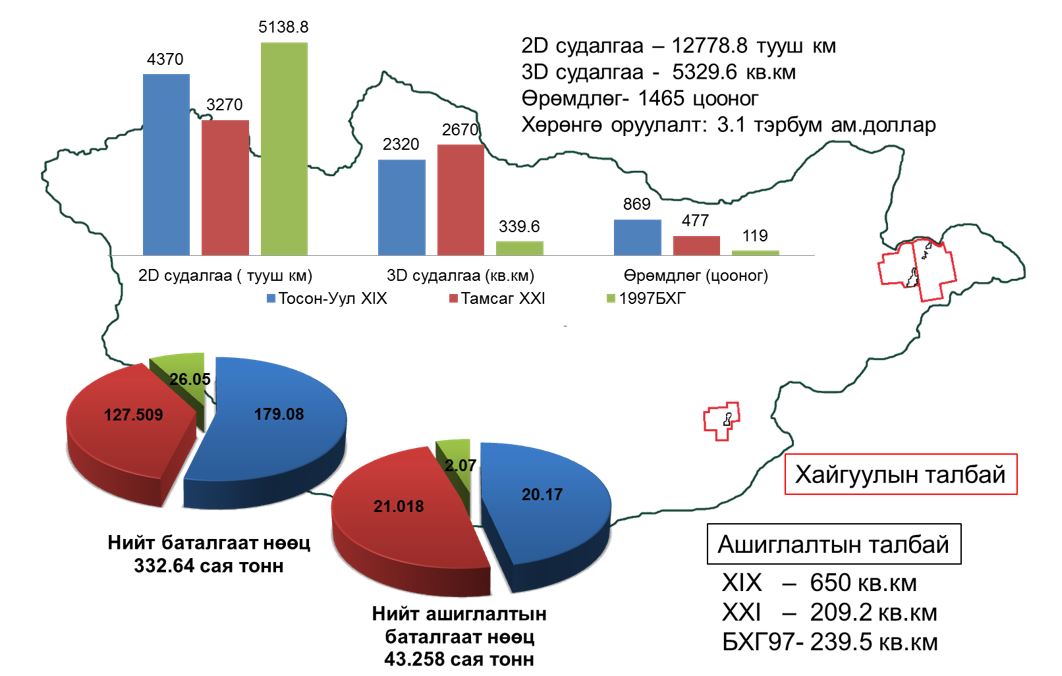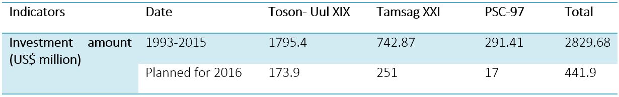 Өнгөрсөн хугацаанд 1993-2024 онд хайгуул, үнэлгээ, туршилтын олборлолт, ашиглалтын нийт 1,746 цооног өрөмдөж, 13.6 мянган тууш км хоёр хэмжээст, 5.4 мянган км2 гурван хэмжээст чичирхийллийн судалгаа хийсэн. 1993-2024 онд Тосон-Уул XIX, Тамсаг XXI, БХГ-97, Матад XX талбайд нийт 4.28 тэрбум ам.доллар (2019-2024 оны тоон мэдээ санхүүгийн шалгалтаар баталгаажаагүй дүн болно)-ын хөрөнгө оруулсан.